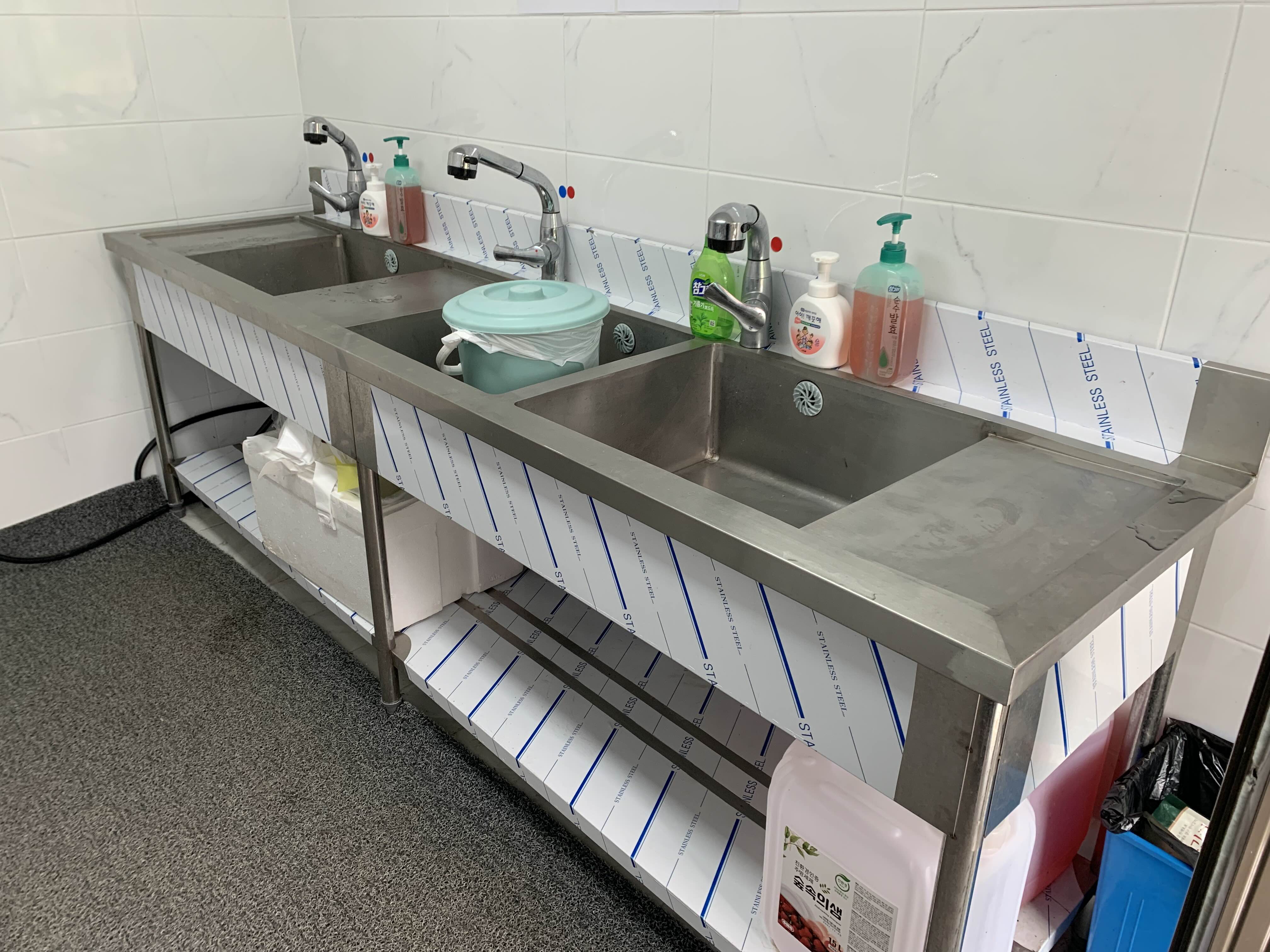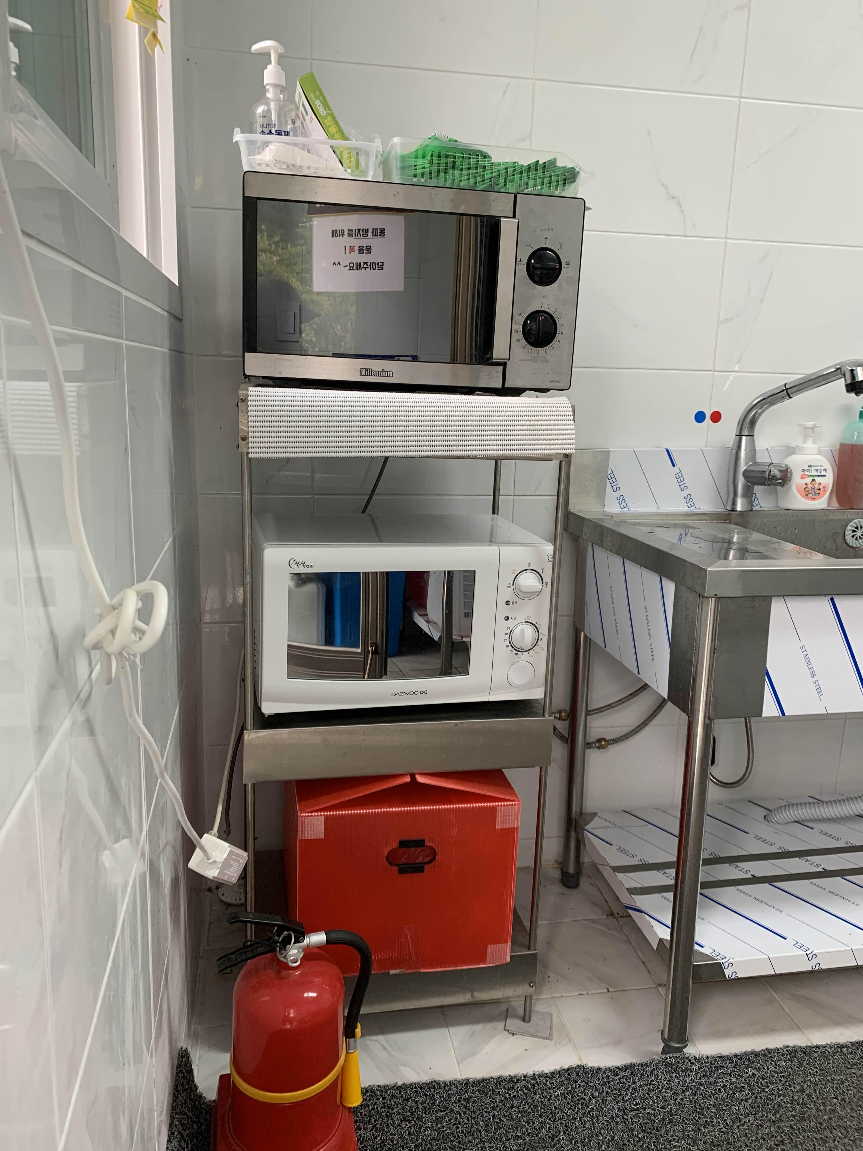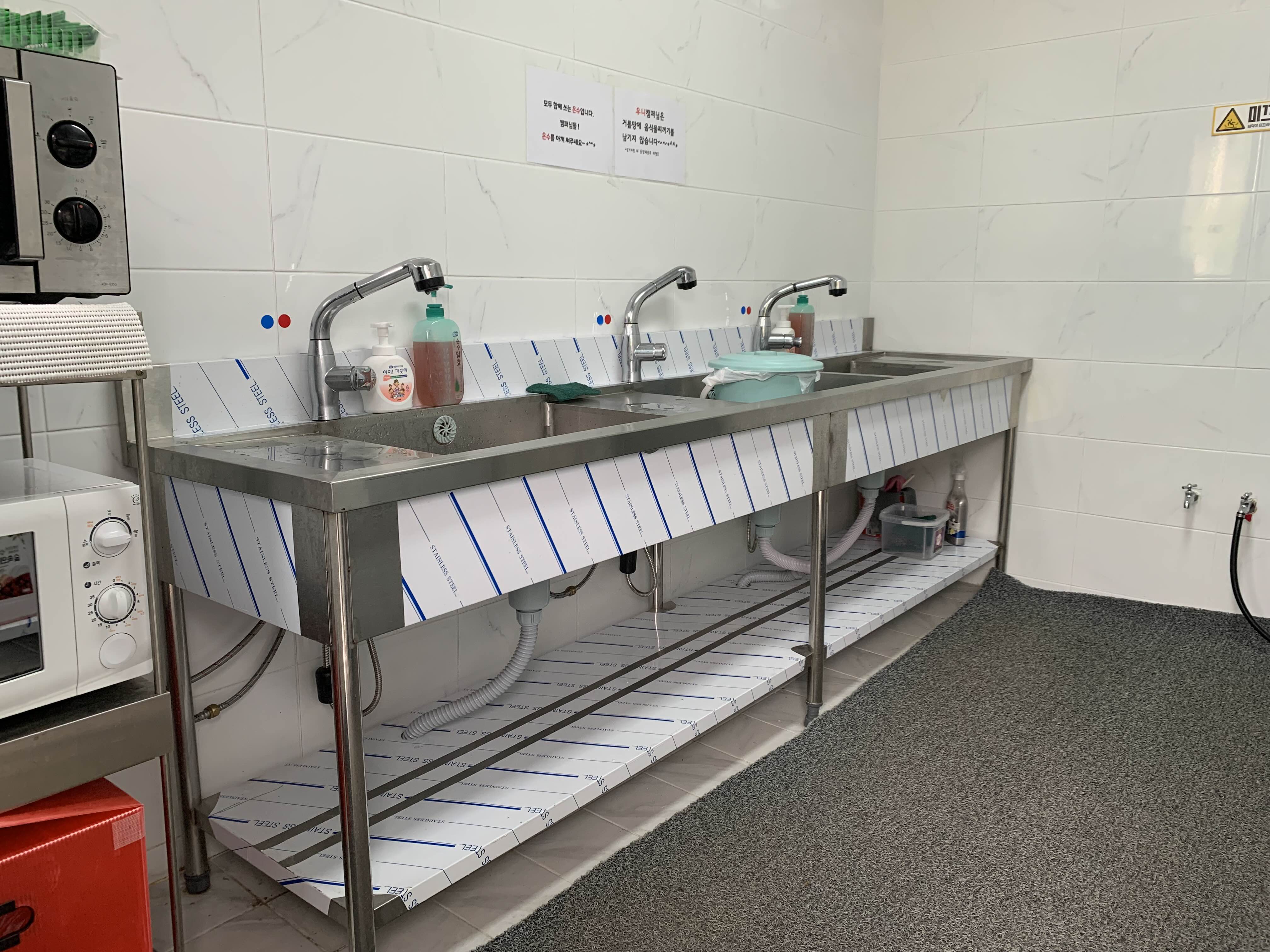 개수대는 우니메이카답게 매우 깨끗하다. 싱크대가 5개, 전자레인지가 2개 있어서 사용할 때 불편함이 없을 듯! 종량제 봉투도 필요한 만큼 가져다 쓸 수 있다. 개수대 이용시간은 오전 8시부터 오후 9시 반까지이다.