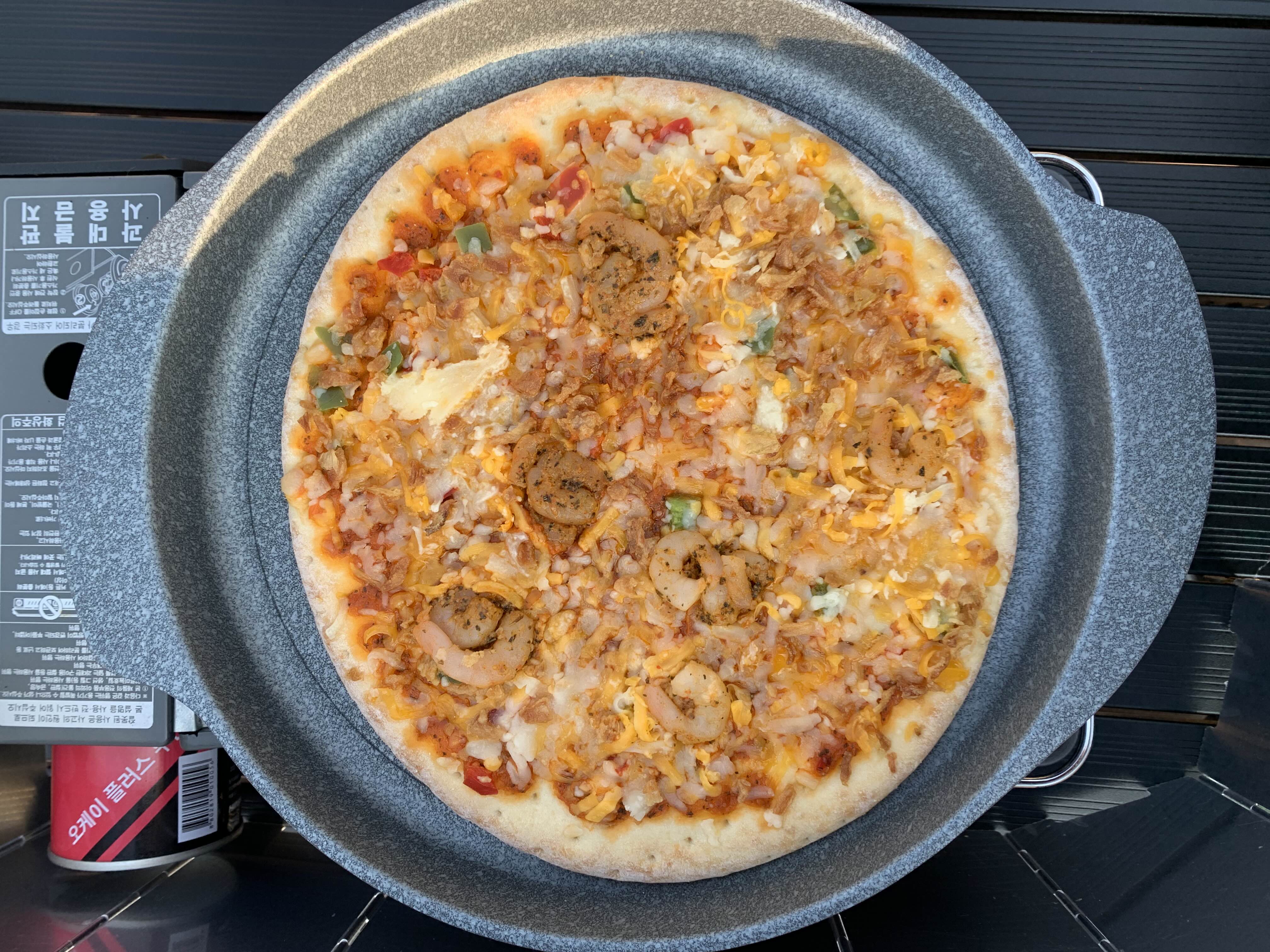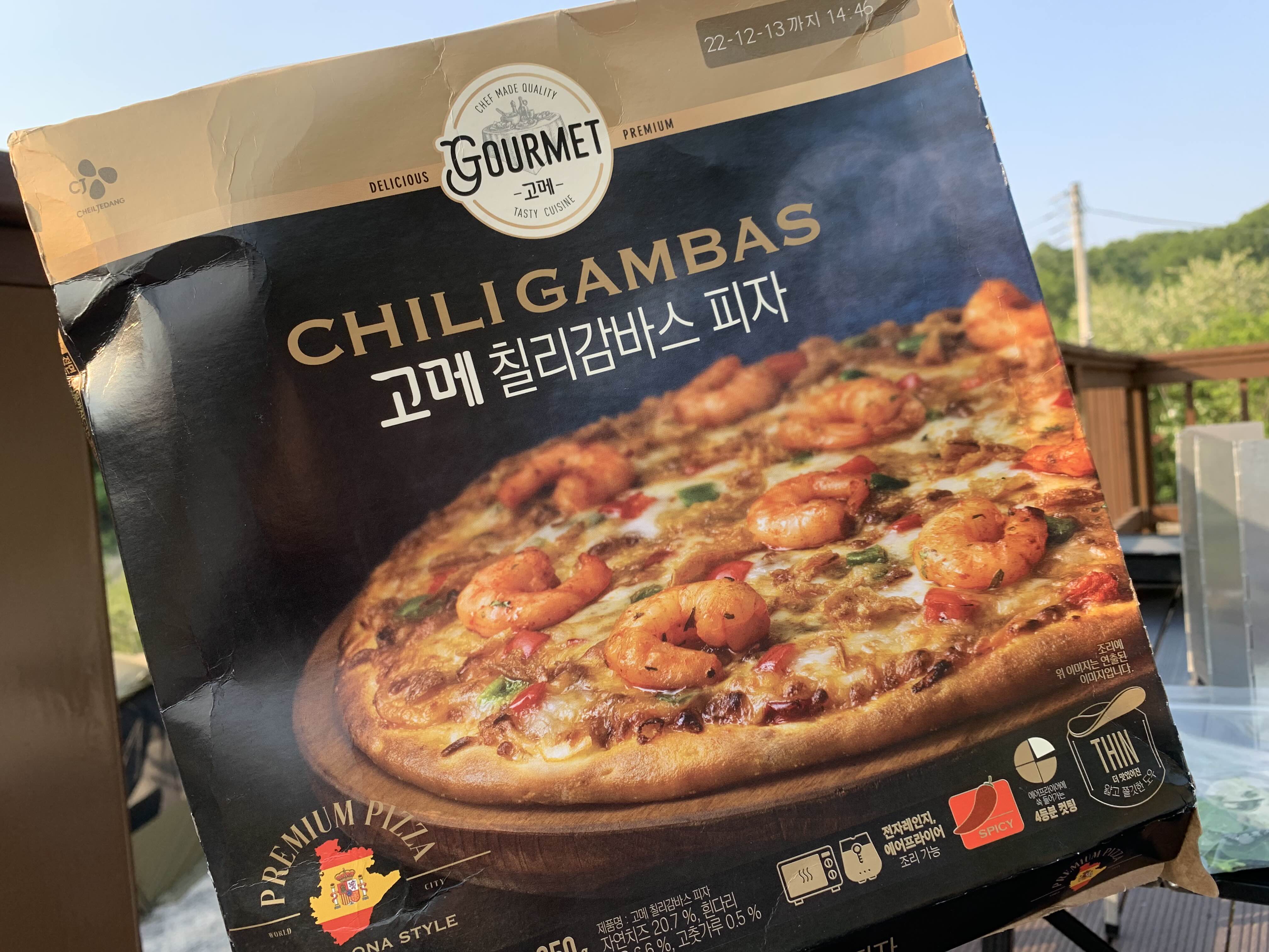 이제 대낮에는 너무 더워서 텐트를 치기 힘들다. 이날도 리빙쉘 텐트를 들고 갔기 때문에 오후 4시에 피칭을 할 엄두가 나지 않았음. 해가 조금 질 때까지 테이블과 의자만 테라스에 펼치고 쉬었다. 그리고 일단 먹음. 첫 번째 메뉴는 고메 칠리감바스 피자. 내가 사랑으로 키운(사실 틔운이 다 키운) 루꼴라를 올려 먹었다. 근데 루꼴라는 오래 두면 넘 맵고 써지는 듯! 갈수록 강해지는 아이이다. 무튼 피자와는 잘 어울렸다.