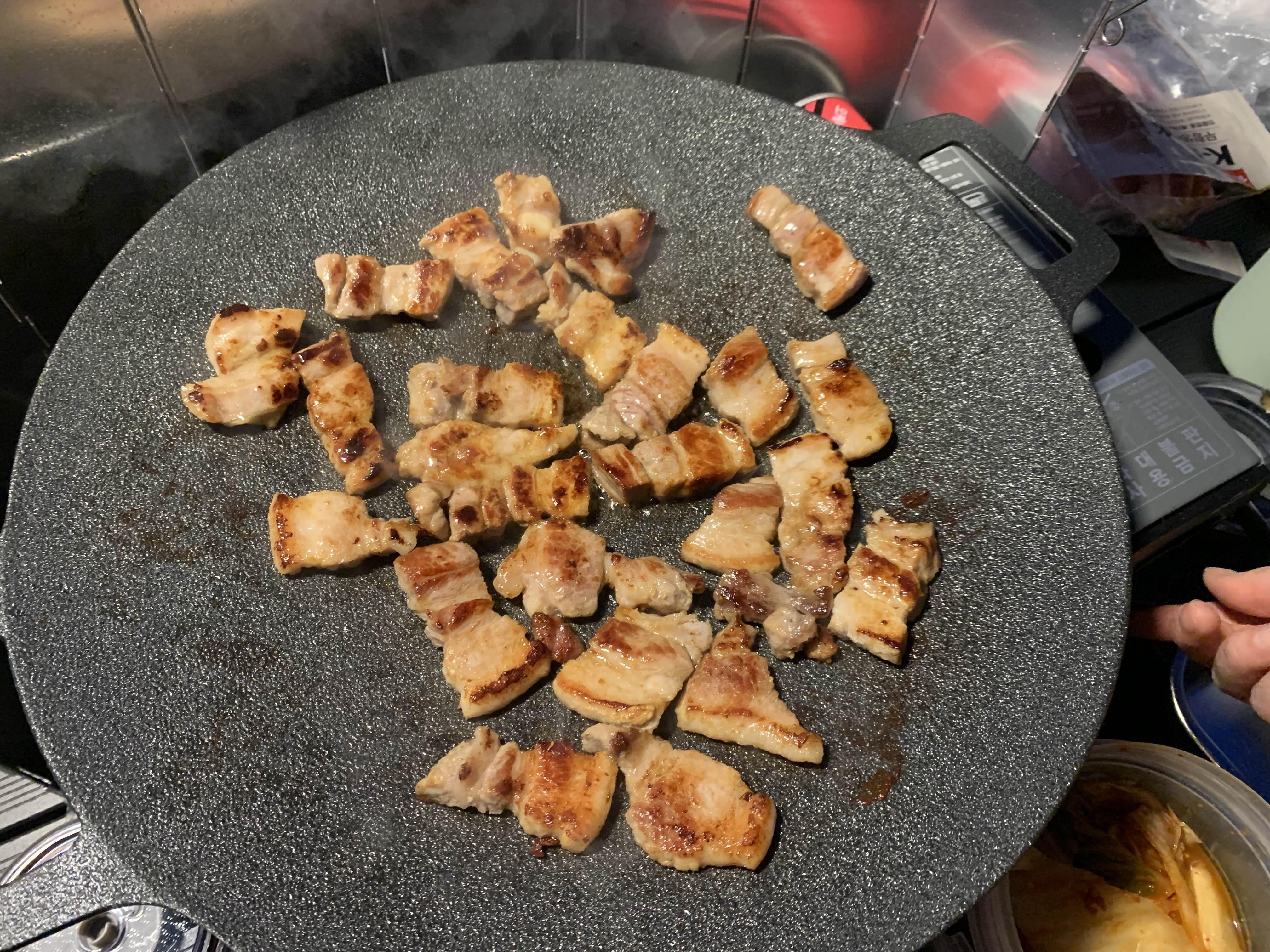 두 번째 메뉴는 삼겹살. 친구가 구워줘뚬!😍 함께 캠핑을 올 때마다 친구가 고기를 굽는 것 같은데(죄송😅) 언제나 맛있다. 이날은 친구 어머니께서 만드신 명이나물과 함께 먹어서 더 존맛탱구리였음.