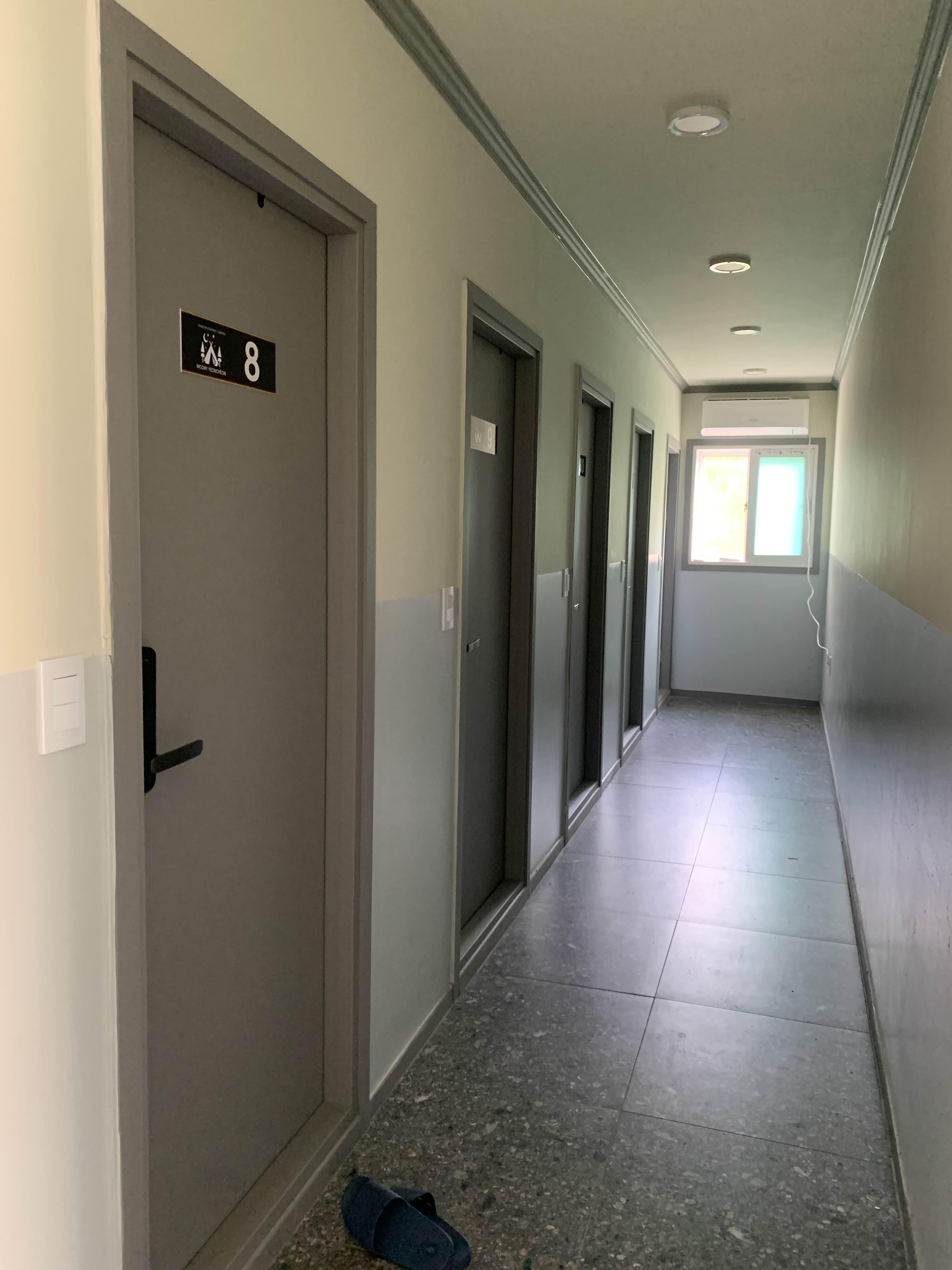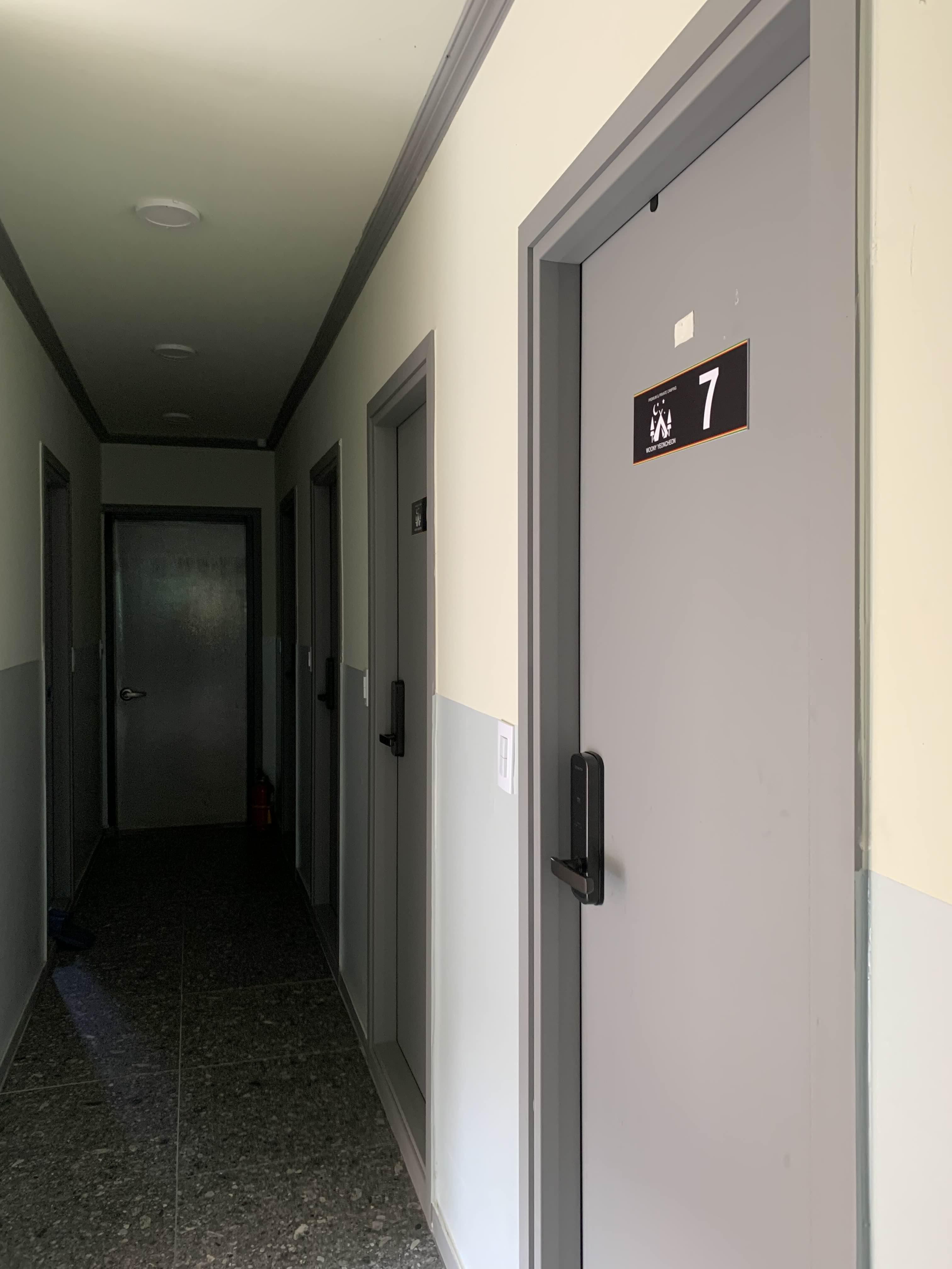 화장실. 우니메이카의 가장 큰 특징 중 하나는 개별화장실이 있다는 것! 우니메이카 연천점에도 10개 정도의 개별화장실이 있다. 복도가 T자형인데 I부분 사진은 안 찍었네.😅 사진에 없는 이 부분에 공용화장실이 있다. 2칸인데 모두 남녀공용이어서 조금 놀랐다. 다행히 이날 공용화장실을 이용하는 사람은 여자들밖에 없었다. 그래도 남녀 구분은 해놓았으면 좋겠다는 것이 나의 생각!
